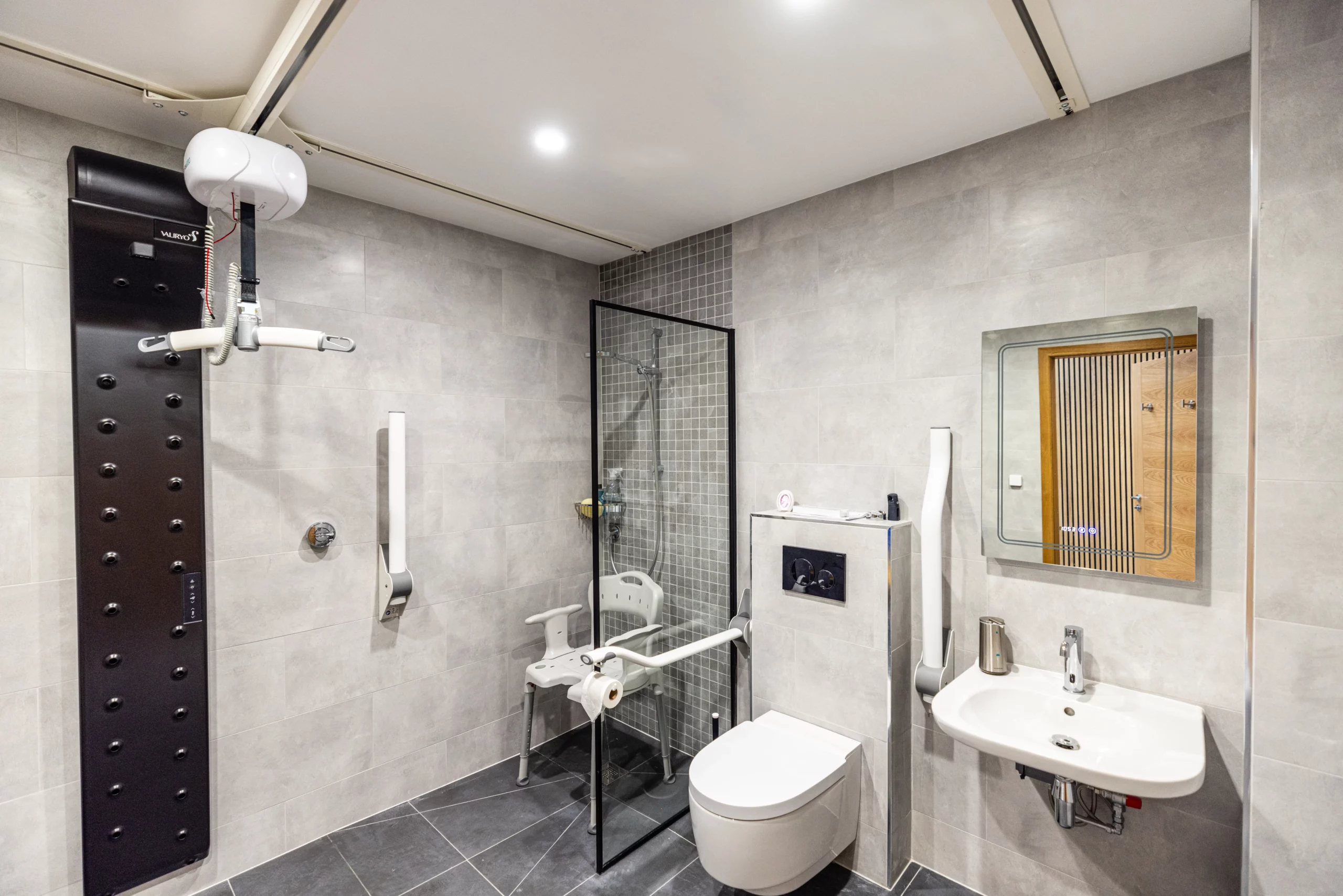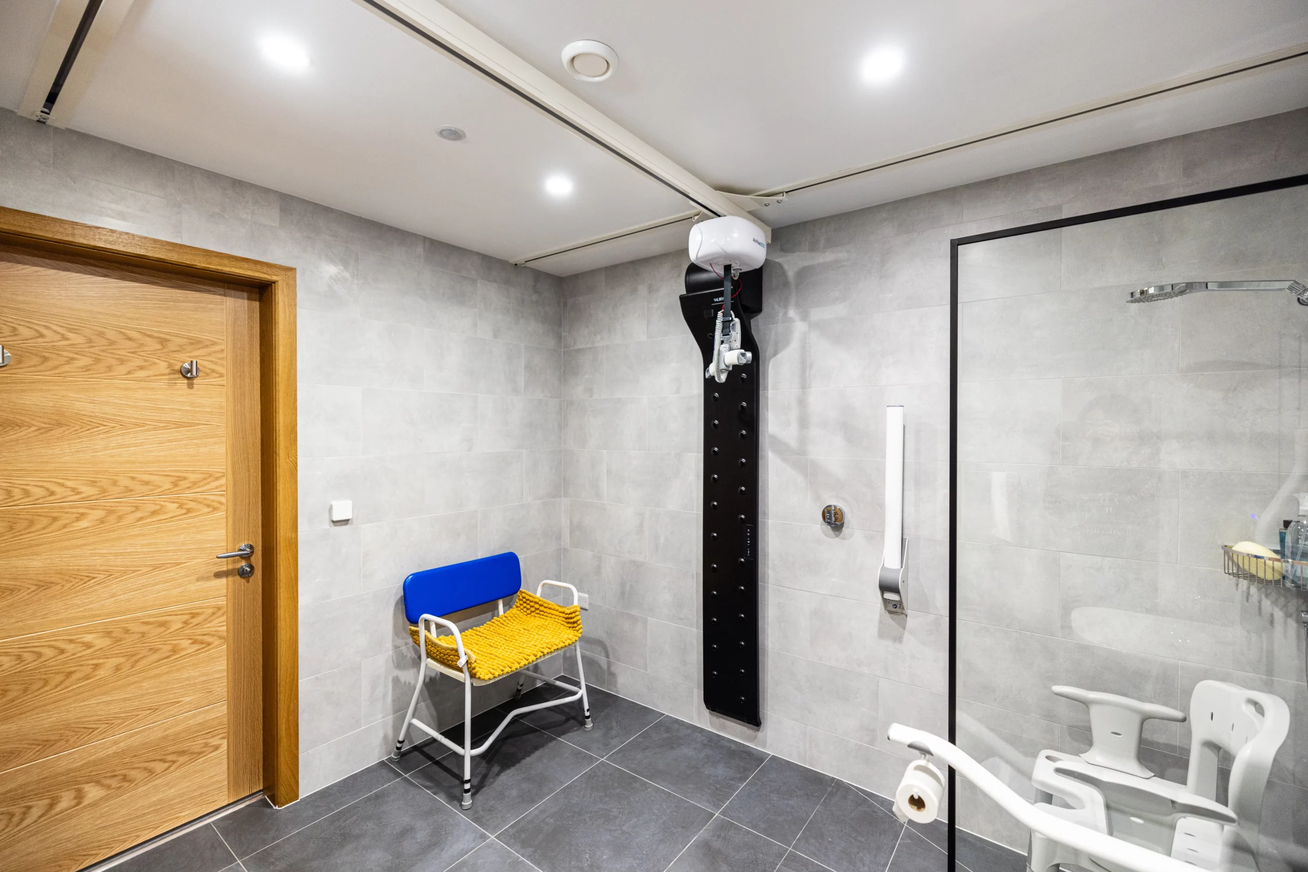 To further enhance Alastair’s independence, Innova installed an AirGlide360 transit coupling, connecting the pool room to his adapted bathroom for easy access. His bathroom now offers maximum mobility with an X-Y hoist providing full room coverage. Additionally, Innova supplied a wall-mounted Geberit Aquaclean Mera Classic wash-dry toilet. This advanced hygiene solution features cleansing shower jets and warm air-drying technology, delivering effective, comfortable cleansing.