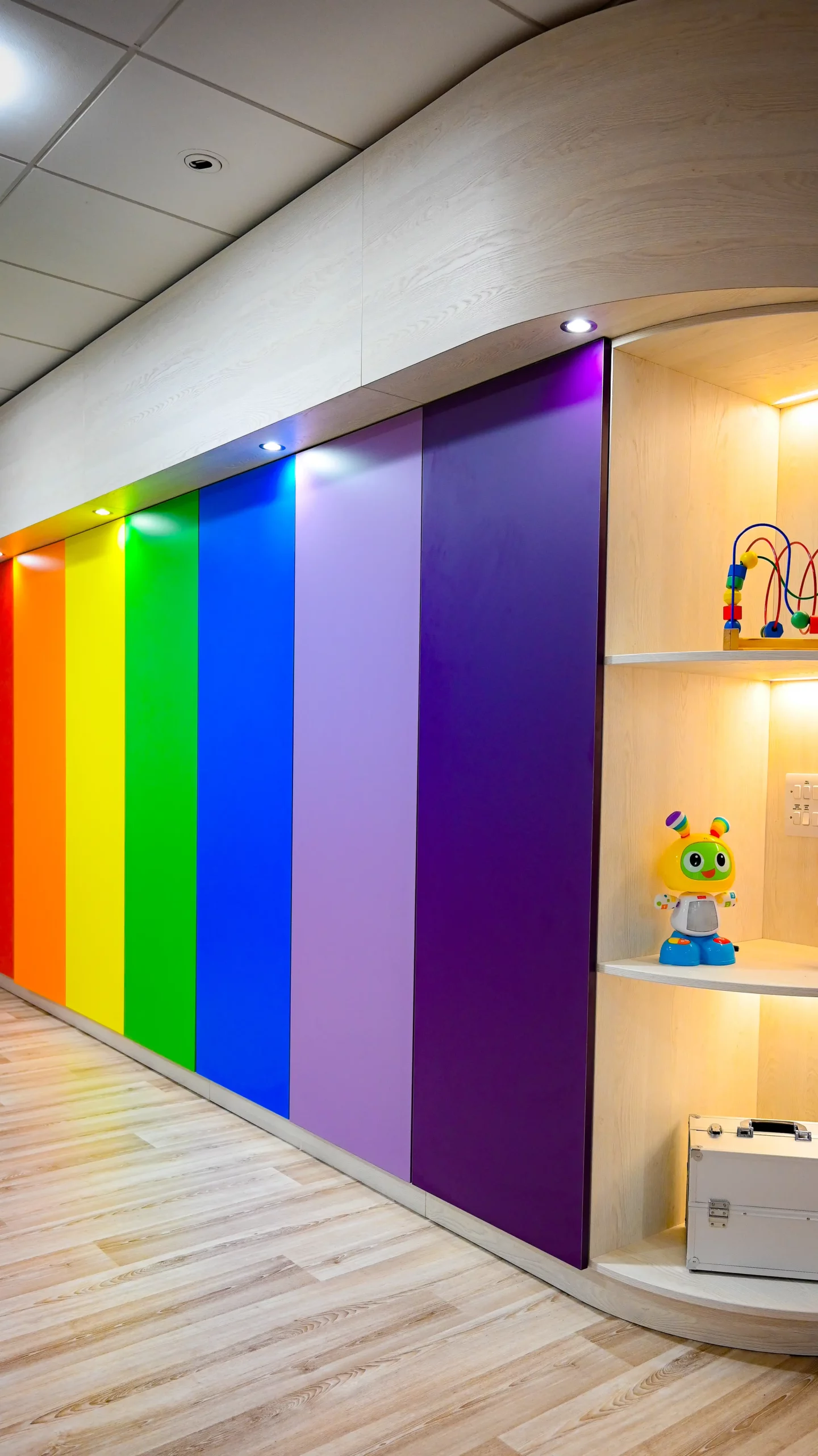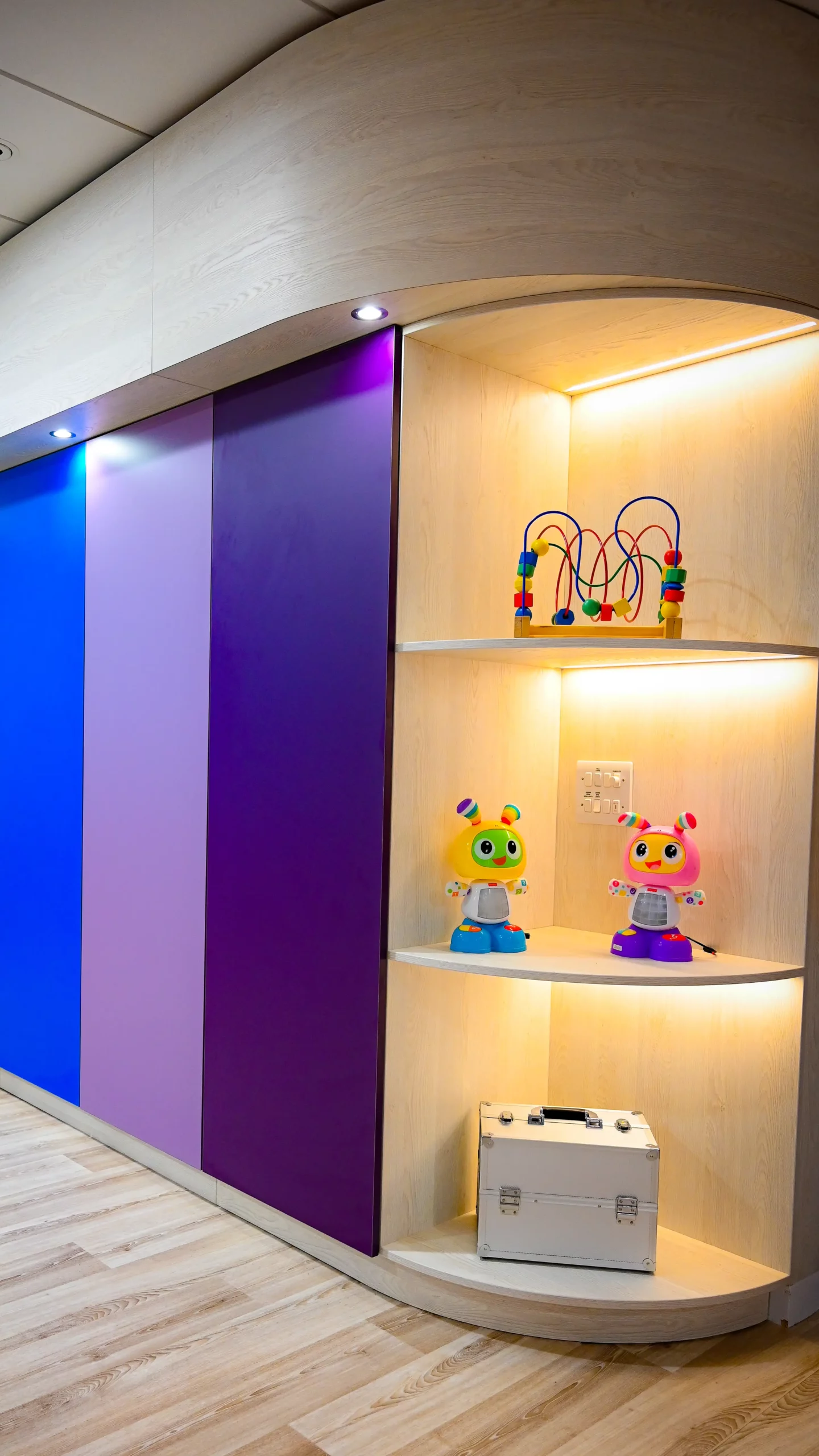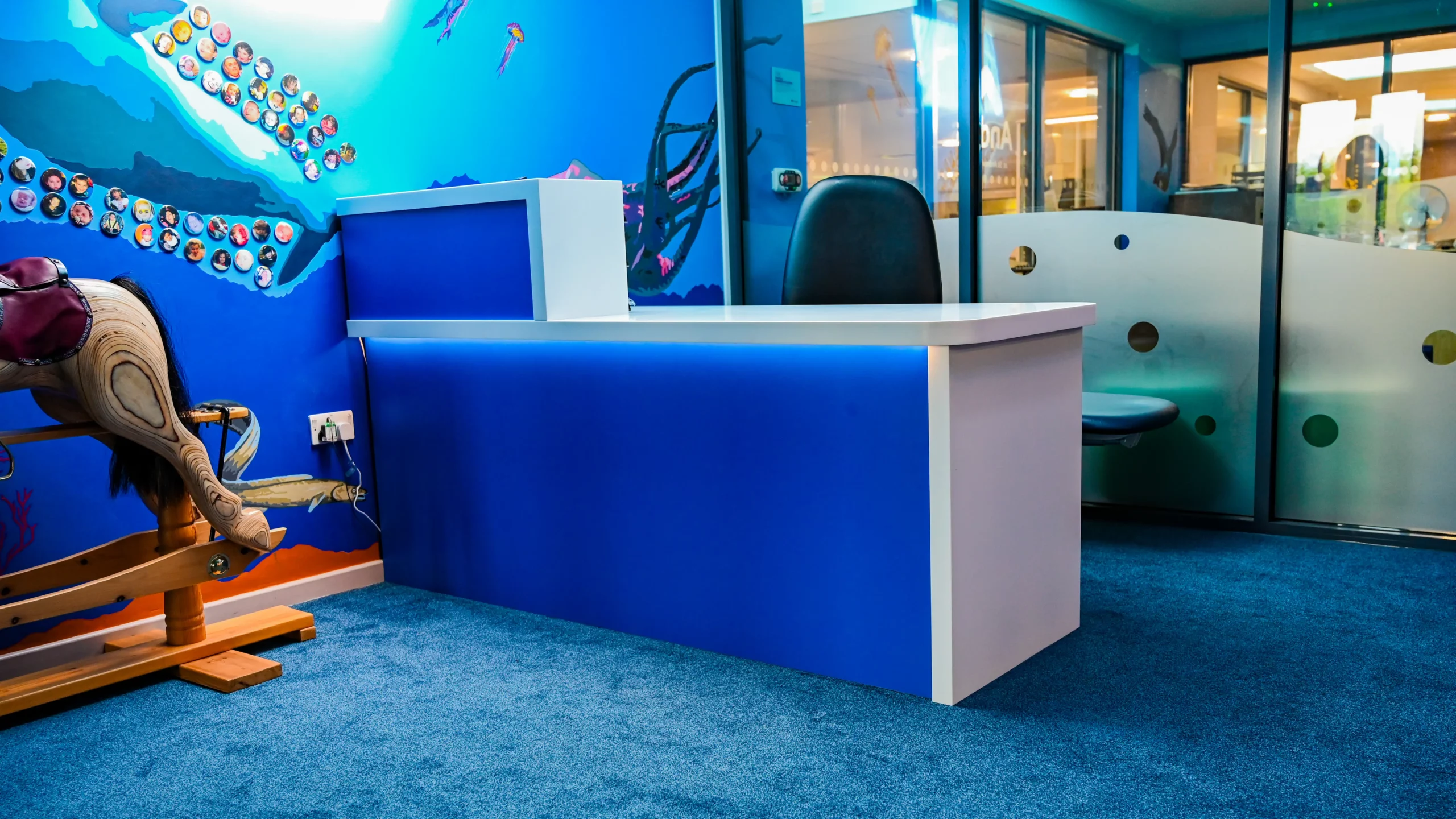 These included a bespoke reception desk with in-built LED lighting and a bespoke 7-door cabinet in the play room, featuring bulk head LED lighting and curved shelving.